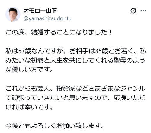 @SportsHochi57歳・オモロー山下が結婚発表 相手は22歳年下「初老と人生を共にしてくれる聖母のような優しい方」 hochi.news/articles/20260…